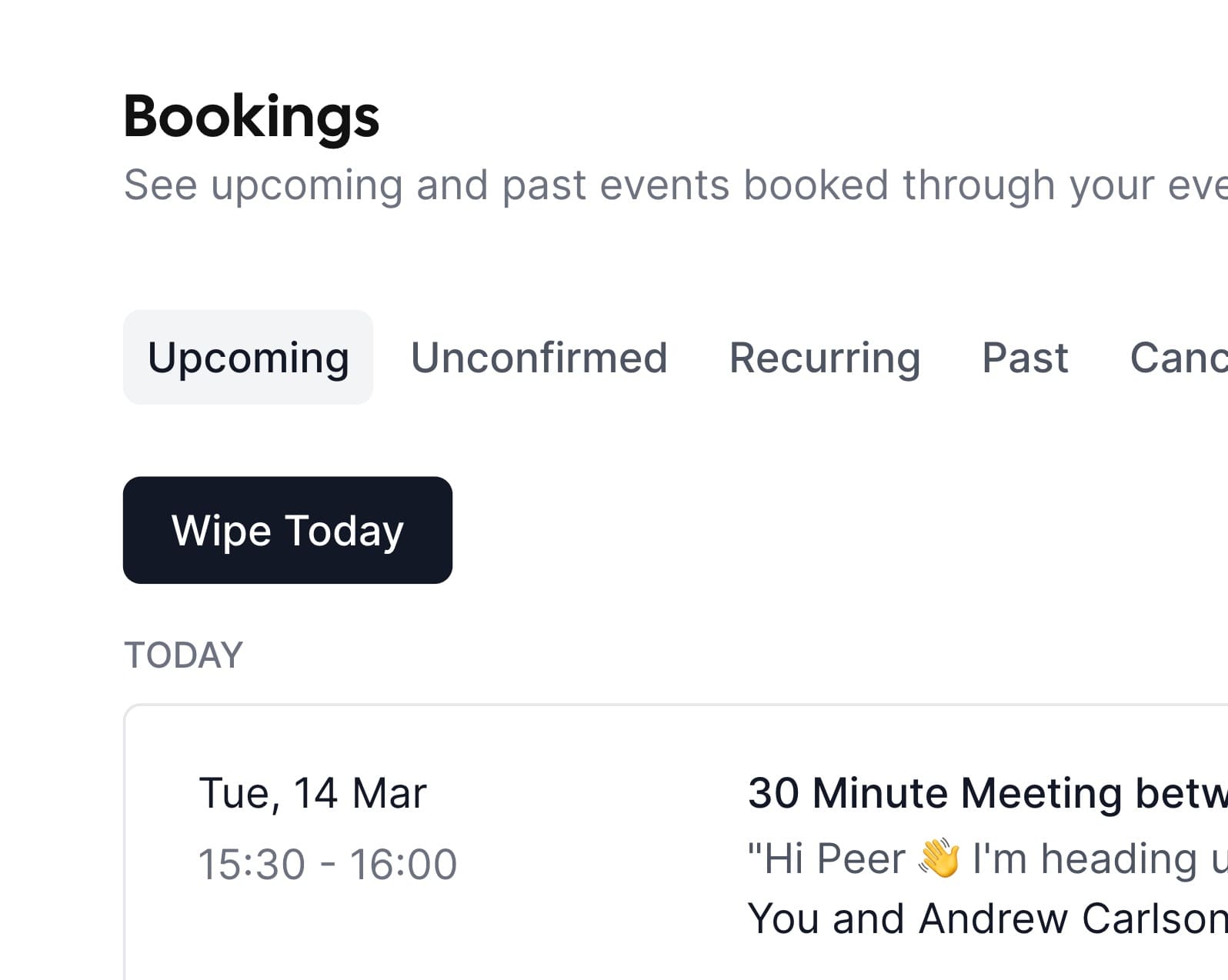 Wipe My Cal is a Cal.com exclusive app that redefines what it looks like to reschedule multiple meetings at the same time. Simply install the app, and select ‘Wipe Today’ in the /booking page to mass reschedule the entire day. Handle emergencies, unexpected sick days and last minute events with the simple click of a button.